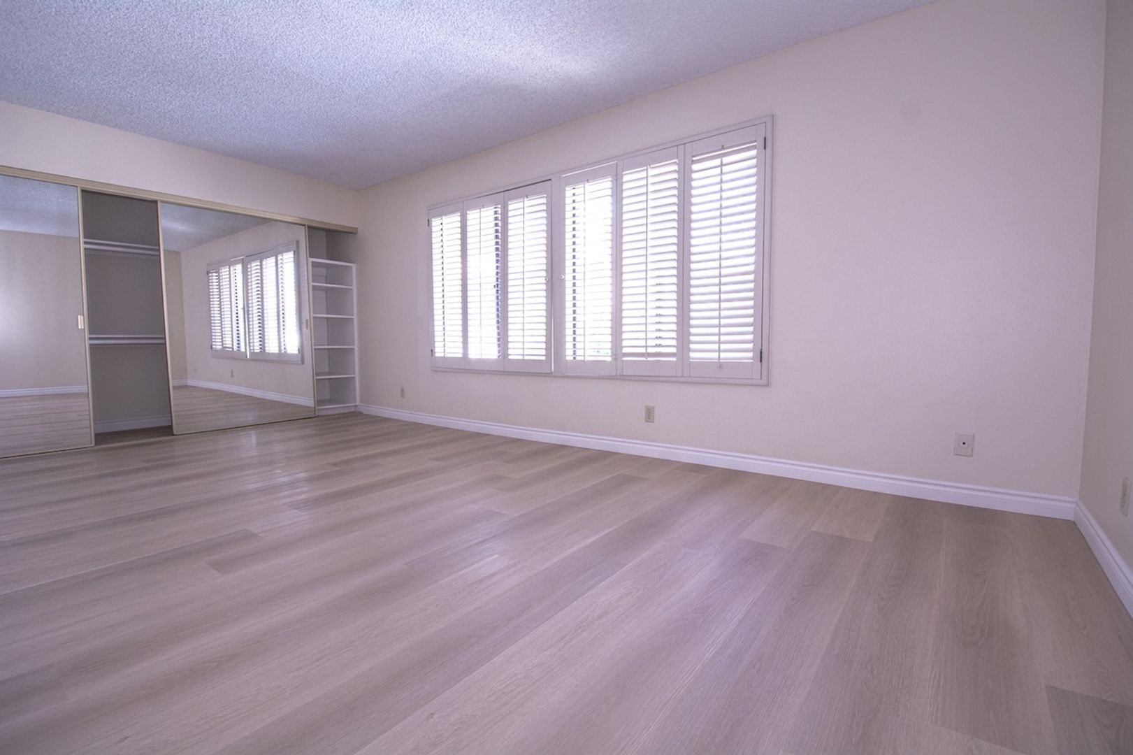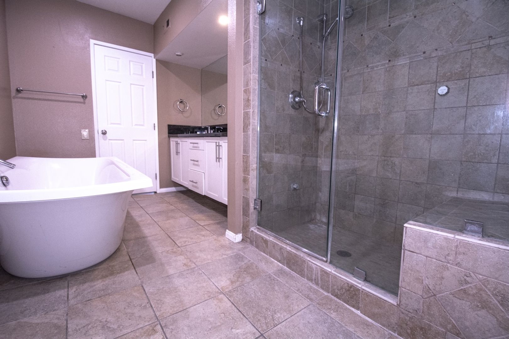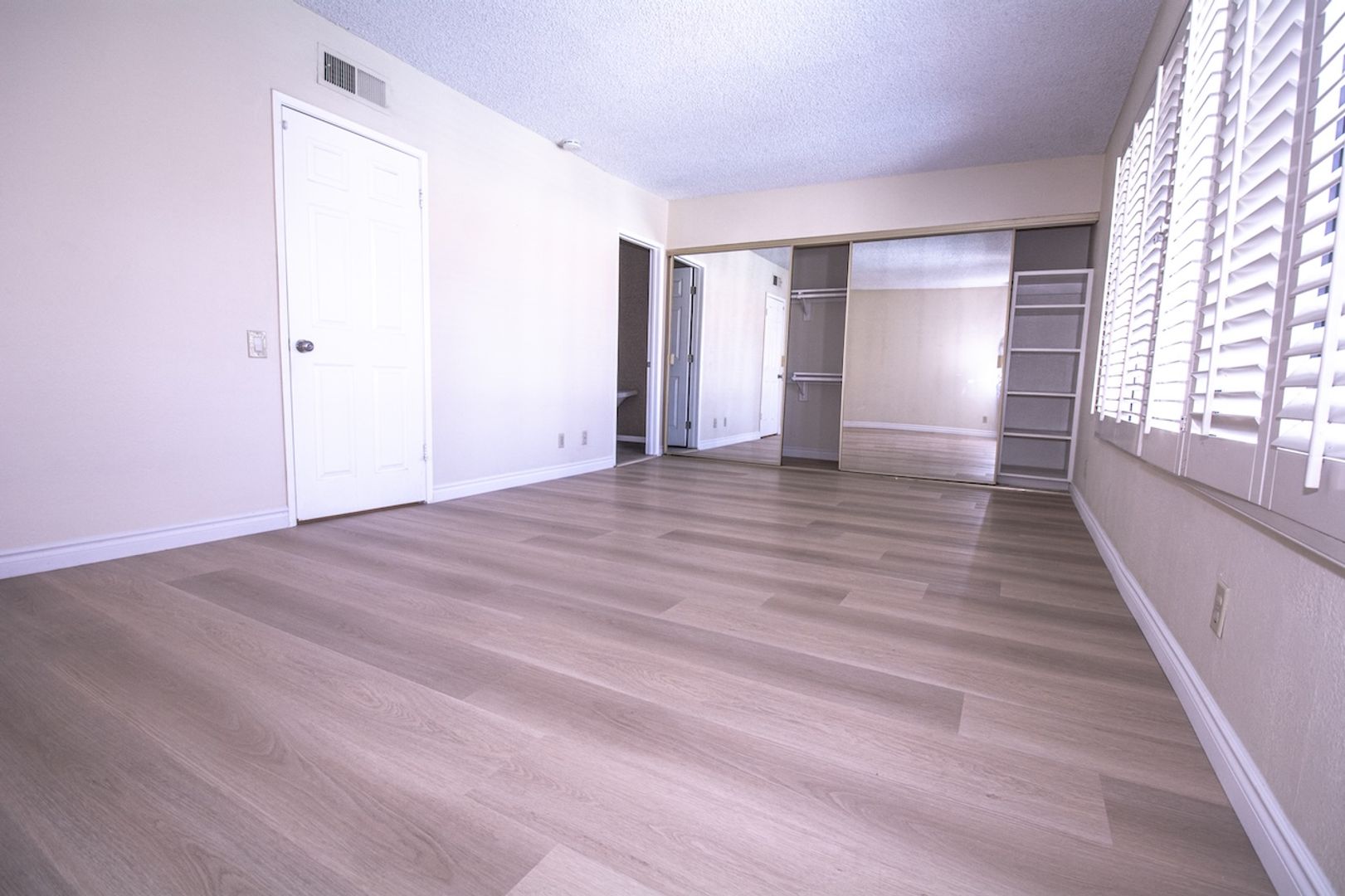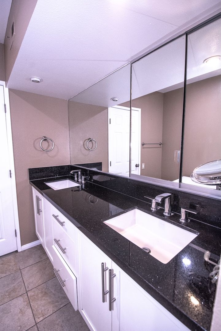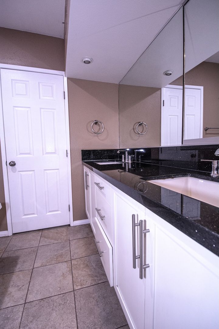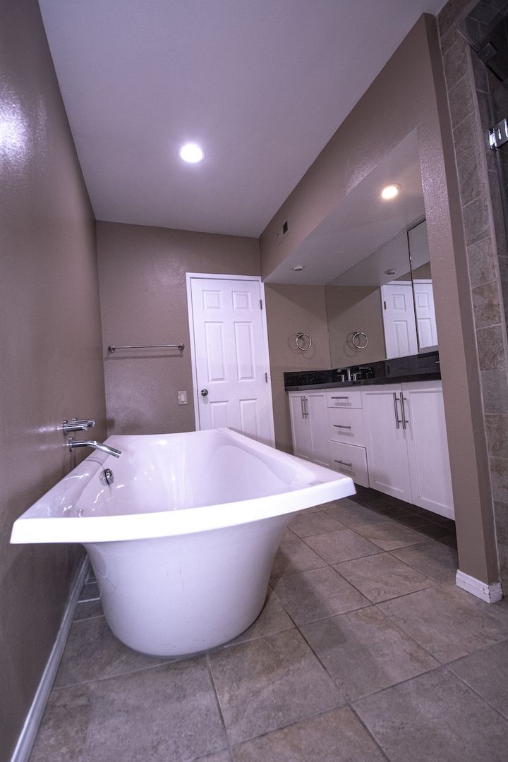 The master bedroom is a dream space, accommodating a full-size king bed and featuring wall-to-wall mirrored closets. The luxurious bathroom is a combination of elegance and comfort, showcasing a stand-alone bathtub with a shower/sauna, fully updated with stylish tiles and upgraded plumbing fixtures. The double vanity is complemented by expansive wall-to-wall mirrors, enhancing the sense of space and sophistication.