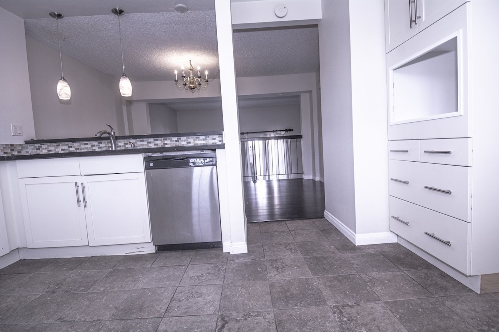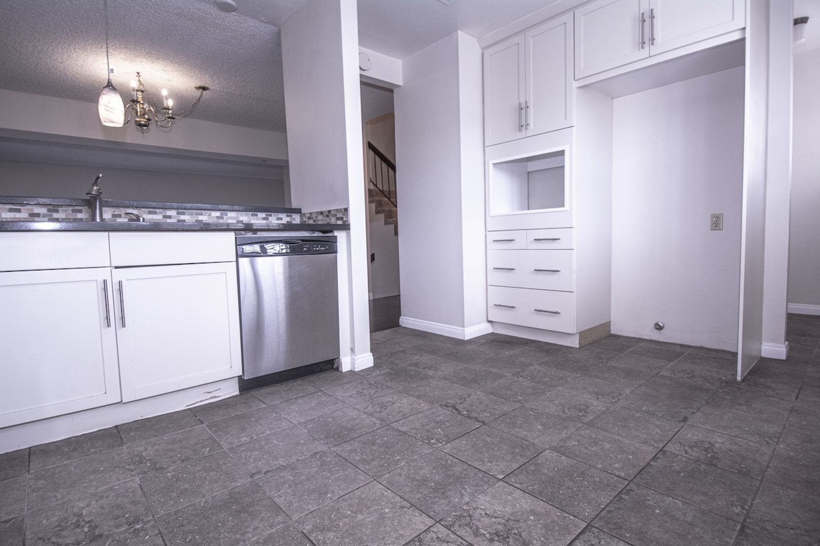 This exceptional unit boasts 2 bedrooms, 2 bathrooms, and a 2-car garage with direct access, offering an ideal living experience. Spread across three levels, the floor plan is both functional and impressive. The first level features a spacious living room adorned with beautiful laminate flooring. The kitchen has been meticulously upgraded with white cabinetry, tile floors, a modern multi-cycle stainless steel dishwasher, a 5-burner stainless steel stove, and a convenient double sink with a disposal unit.